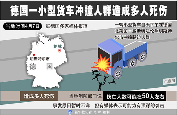 新華社柏林4月7日電(記者袁帥 沈忠浩)據德國多家媒體7日報道,一輛小型貨車當天下午在德國西部北萊茵-威斯特法倫州明斯特爾市沖撞路邊人群,造成多人死傷。當地消防部門說,傷亡人數可能在50人左右。
