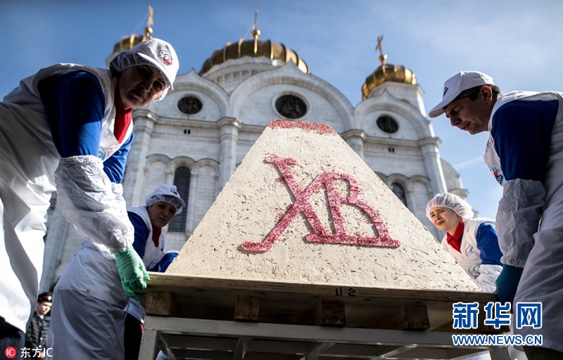 當(dāng)?shù)貢r間2018年4月8日,俄羅斯莫斯科,為慶祝東正教復(fù)活節(jié),莫斯科救世主大教堂前現(xiàn)一個1141公斤的傳統(tǒng)復(fù)活節(jié)蛋糕,打破吉尼斯世界紀錄。(圖片來源:東方IC)