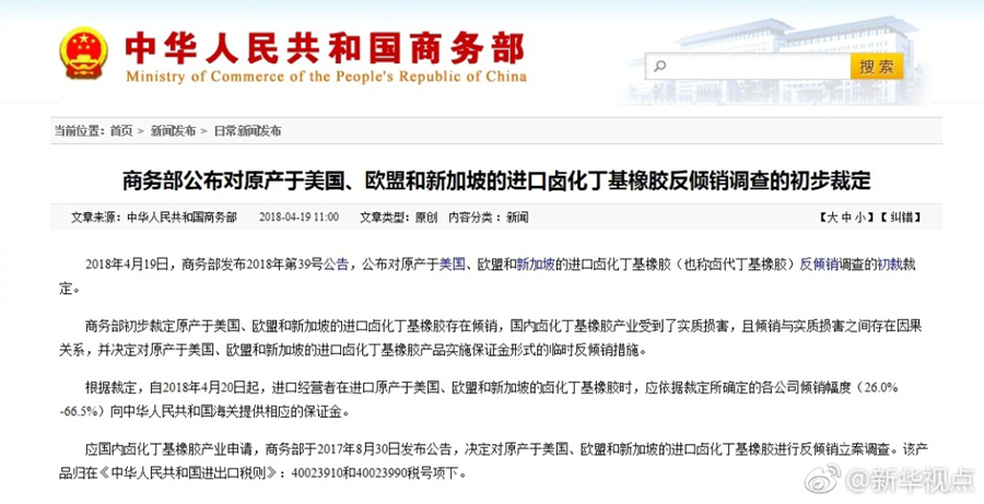 新華網(wǎng)北京4月19日電 商務(wù)部今天發(fā)布公告,初步裁定原產(chǎn)于美國、歐盟和新加坡的進(jìn)口鹵化丁基橡膠存在傾銷。根據(jù)裁定,自2018年4月20日起,進(jìn)口經(jīng)營者在進(jìn)口原產(chǎn)于美國、歐盟和新加坡的鹵化丁基橡膠時,應(yīng)依據(jù)裁定所確定的各公司傾銷幅度(26.0%-66.5%)向中華人民共和國海關(guān)提供相應(yīng)的保證金。?(據(jù)新華社“新華視點”微博報道)