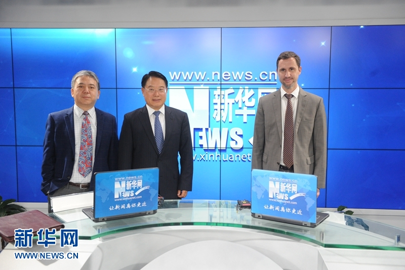 4月24日,聯(lián)合國工業(yè)發(fā)展組織總干事李勇(中)在北京接受了新華網(wǎng)獨(dú)家專訪。圖為李勇和聯(lián)合國工業(yè)發(fā)展組織副代表馬?。ㄗ螅┖吐?lián)合國工業(yè)發(fā)展組織區(qū)域首席代表(中國、朝鮮、蒙古國)包銳理(右)一行。新華網(wǎng)記者 陳競(jìng)超攝