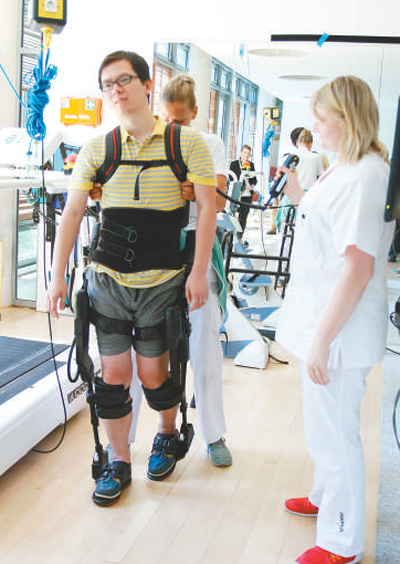 民眾在德國體驗(yàn)背負(fù)式康復(fù)機(jī)器。記者 管克江 攝