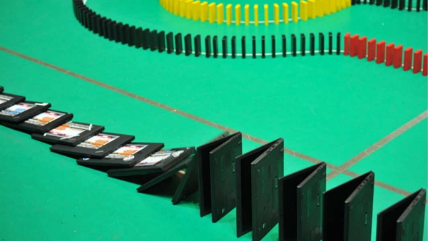 此次的多米諾挑戰(zhàn)除了520臺筆記本外,還準備了45000枚骨牌?;顒又黝}以及工程師們標志性的代碼都成為了多米諾骨牌整體設計的一部分。最終,所有多米諾骨牌和筆記本電腦全部被成功推倒。