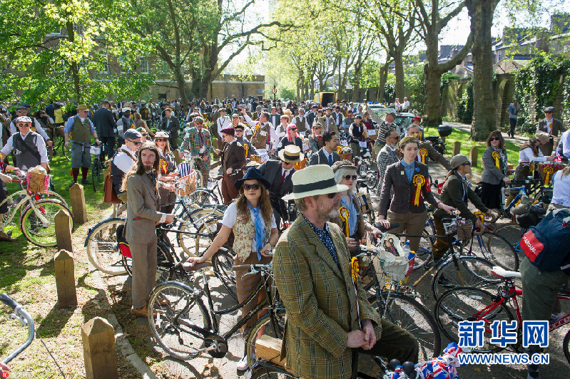 當(dāng)?shù)貢r(shí)間2018年5月5日,英國倫敦,當(dāng)?shù)嘏e辦復(fù)古騎行活動(dòng),民眾身穿花呢子服裝騎車穿行在倫敦街頭。今年是該活動(dòng)舉辦十周年。(圖片來源:東方IC)