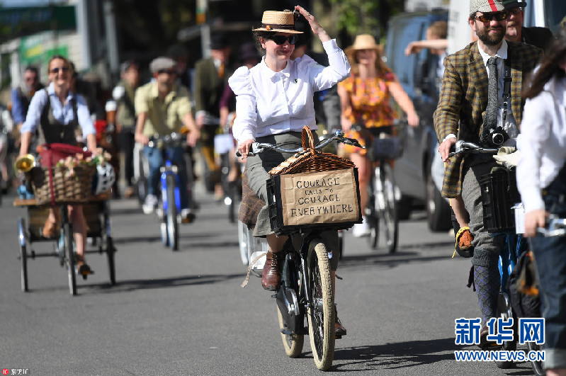 當(dāng)?shù)貢r(shí)間2018年5月5日,英國(guó)倫敦,當(dāng)?shù)嘏e辦復(fù)古騎行活動(dòng),民眾身穿花呢子服裝騎車穿行在倫敦街頭。今年是該活動(dòng)舉辦十周年。(圖片來源:東方IC)