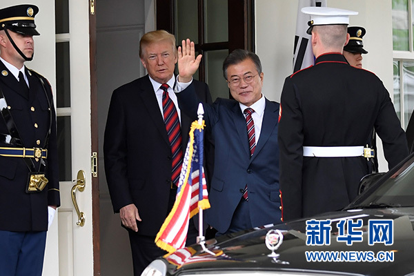5月22日,美國(guó)總統(tǒng)特朗普(左二)在華盛頓白宮歡迎到訪的韓國(guó)總統(tǒng)文在寅(左三)。 新華社記者楊承霖?cái)z