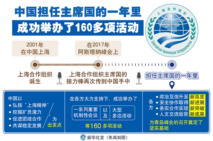 王毅指出,17年前,上海合作組織誕生于中國。在去年阿斯塔納峰會(huì)上,上海合作組織主席國的接力棒再次傳到中國手中。擔(dān)任主席國的一年里,我們以弘揚(yáng)“上海精神”、挖掘擴(kuò)員潛力、促進(jìn)團(tuán)結(jié)合作、共謀穩(wěn)定發(fā)展為出發(fā)點(diǎn),在各方大力支持下,成功舉辦了一系列重要機(jī)制性會(huì)議以及大型多邊活動(dòng)等160多項(xiàng)活動(dòng)。各方政治互信升至新高度,安全協(xié)作取得新進(jìn)展,務(wù)實(shí)合作實(shí)現(xiàn)新突破,人文交流收獲新成果,為青島峰會(huì)的召開奠定了堅(jiān)實(shí)基礎(chǔ)。