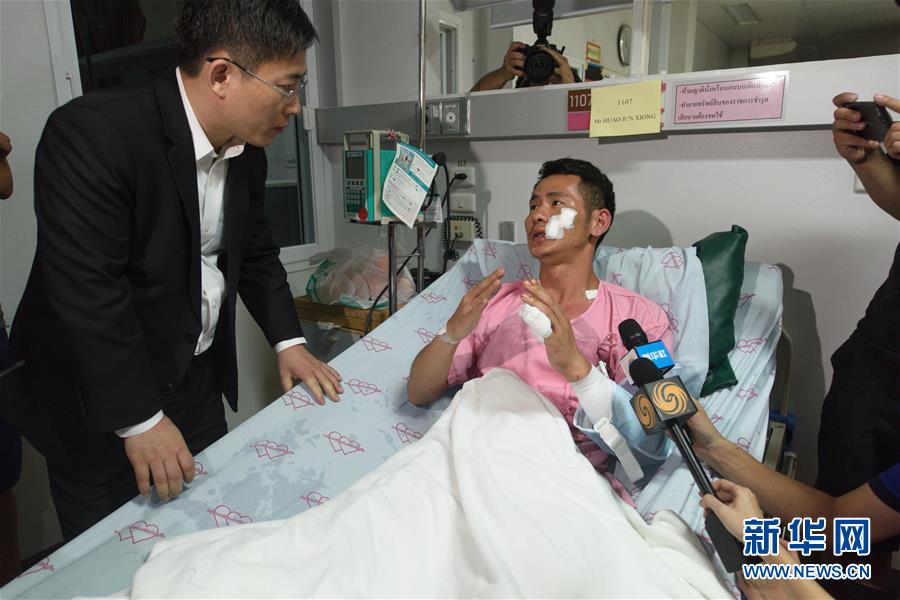 7月7日凌晨,在泰國普吉島,翻船事故幸存者黃俊雄向中國駐泰國大使呂?。ㄗ螅┗貞浱由?jīng)歷。新華社記者秦晴 攝