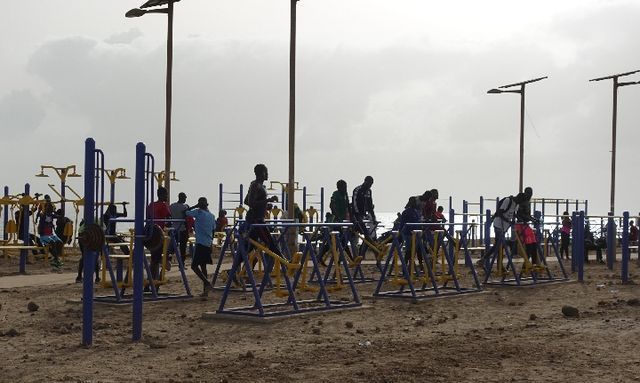 2018年7月18日,塞內加爾首都達喀爾,當地民眾在濱海大道健身公園內鍛煉。(新華社記者賴向東攝)