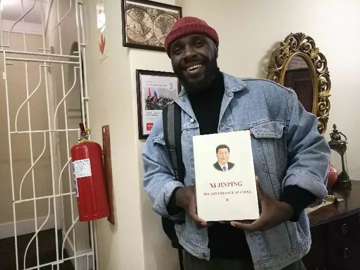 2018年7月20日,南非約翰內(nèi)斯堡大學(xué)孔子學(xué)院,學(xué)院職員邦加恩向記者展示剛從圖書室借到的《習(xí)近平談治國理政》(第二卷)英文版。(新華社記者劉衛(wèi)兵攝)