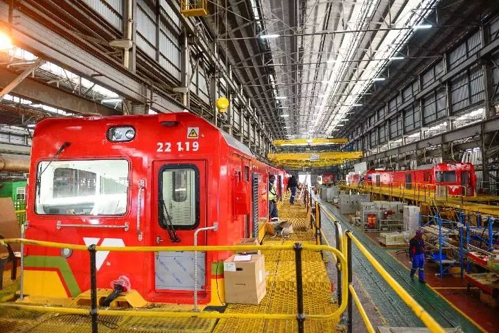 2017年7月27日,南非比勒陀利亞南非運(yùn)輸集團(tuán)工廠組裝車間,兩臺(tái)中國機(jī)車等待組裝。(新華社記者翟健嵐攝)