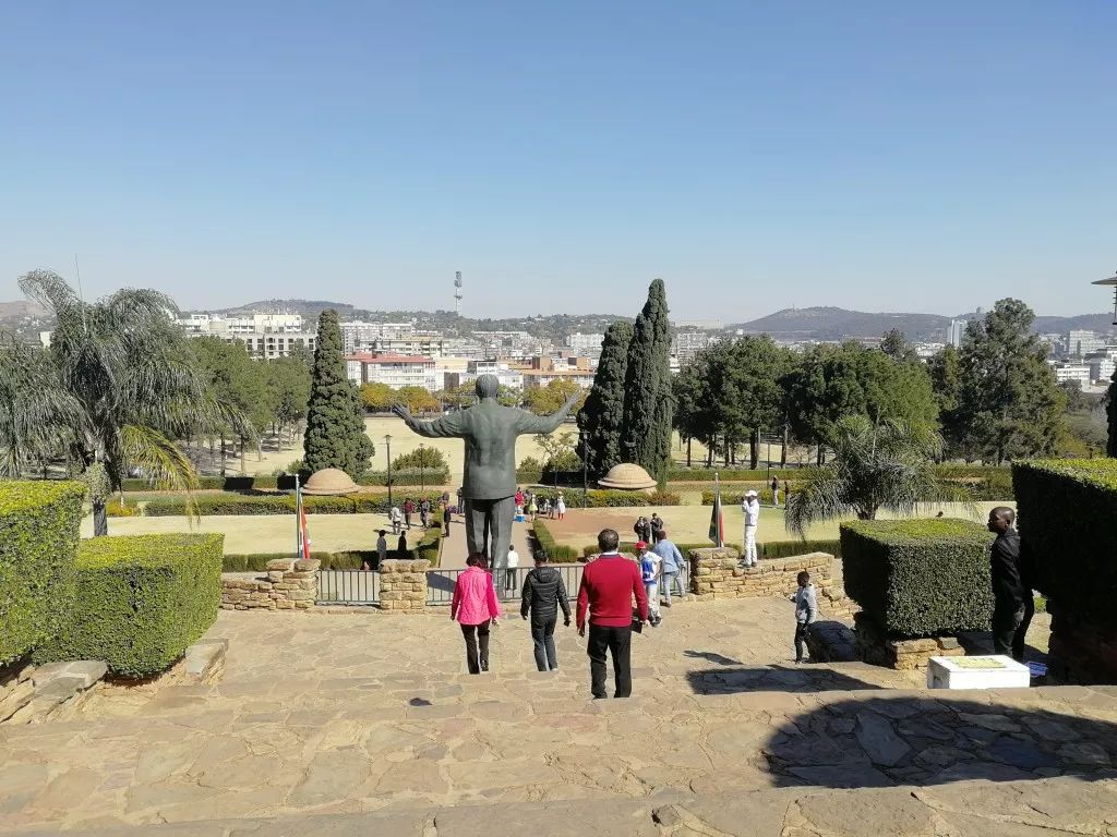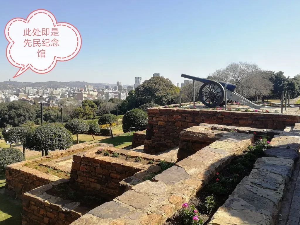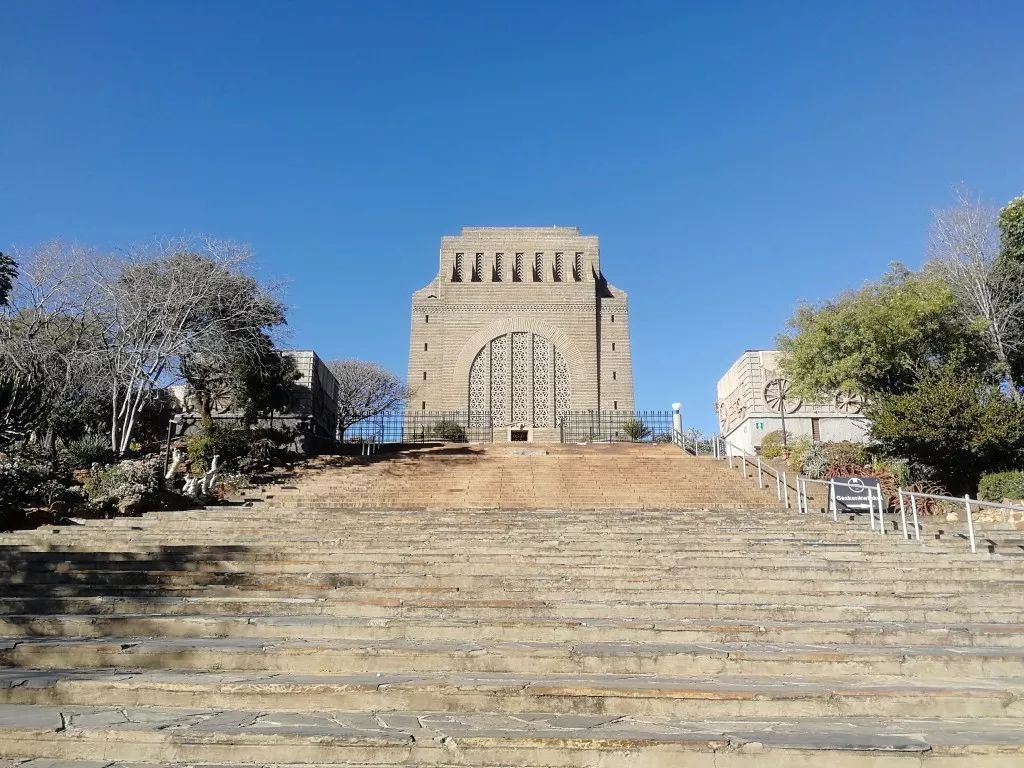 站在聯(lián)邦大廈前,可以從山坡上俯瞰比勒陀利亞全城。對面山坡上方形建筑,就是南非著名的先民紀(jì)念館(Voortrekker Monument)。