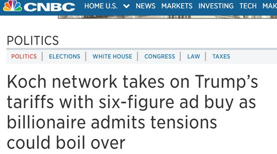 可隨著之后特朗普對(duì)中國(guó)等國(guó)發(fā)動(dòng)貿(mào)易戰(zhàn)的行為,以及相關(guān)惡果的逐漸顯現(xiàn),科赫家族的最新表態(tài)也與今年1月的言論形成了鮮明的對(duì)比。