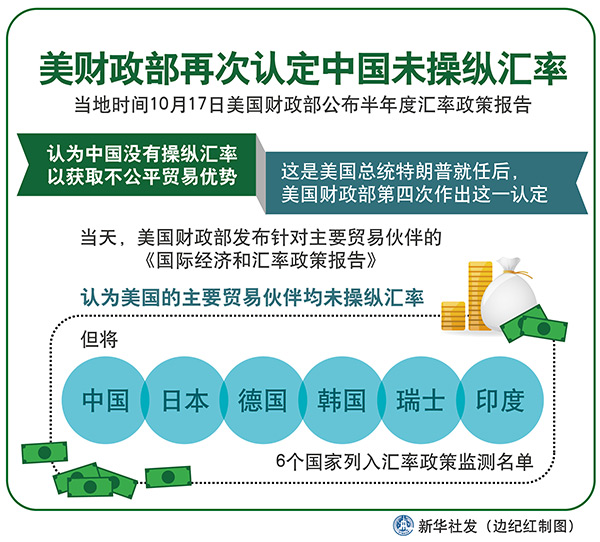 新華社華盛頓10月17日電(記者楊承霖 高攀)美國財政部17日公布半年度匯率政策報告,認(rèn)為中國沒有操縱匯率以獲取不公平貿(mào)易優(yōu)勢。這是美國總統(tǒng)特朗普就任后,美國財政部第四次作出這一認(rèn)定。