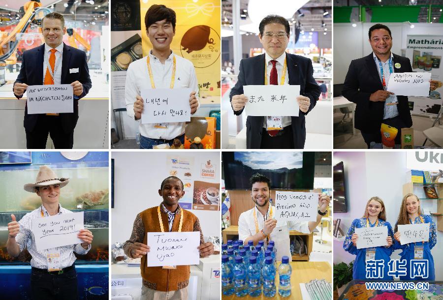 11月10日,進(jìn)博會(huì)上不同國(guó)家的參展人員展示用不同語(yǔ)言書(shū)寫的“明年見(jiàn)”(拼版照片)。 首屆中國(guó)國(guó)際進(jìn)口博覽會(huì)11月5日至10日在上海舉行。記者在采訪中了解到,很多參展商在進(jìn)博會(huì)上收獲了不少訂單,宣傳了自己的產(chǎn)品,結(jié)識(shí)了很多朋友。他們表示,希望明年再來(lái)進(jìn)博會(huì)。 新華社記者 侯東濤 攝