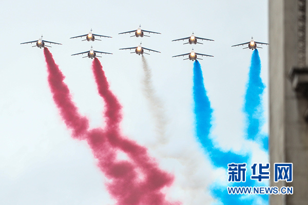 11月11日,法國空軍“法蘭西巡邏兵”飛行表演隊(duì)在一戰(zhàn)結(jié)束百年紀(jì)念儀式上飛過巴黎凱旋門。 新華社記者 鄭煥松 攝