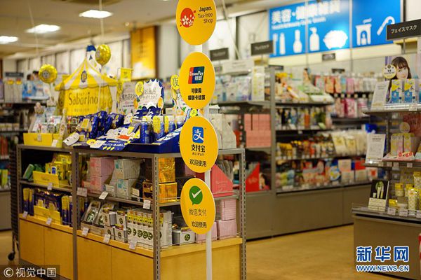 7月14日,日本大阪的某商場(chǎng),幾乎每一個(gè)專柜前都立有中國(guó)移動(dòng)支付的提示牌。(圖片來(lái)源:視覺(jué)中國(guó))