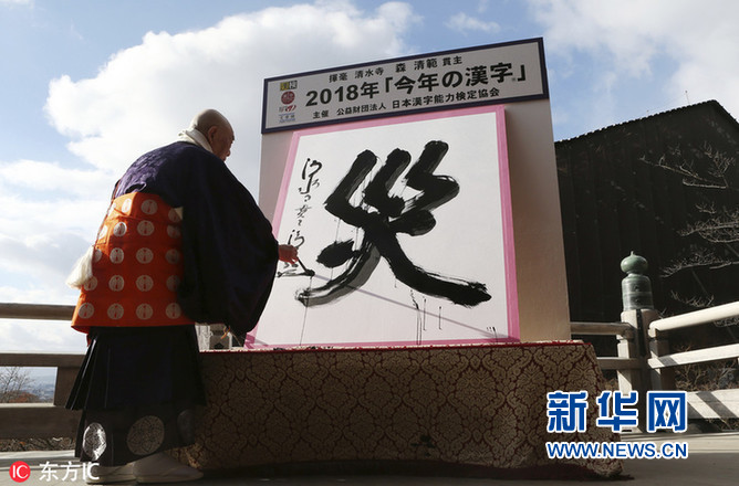 當(dāng)?shù)貢r(shí)間2018年12月12日,日本京都,京都清水寺住持森清范在巨幅和紙上揮毫寫(xiě)下了今年的年度漢字——“災(zāi)”。(圖片來(lái)源:東方IC)
