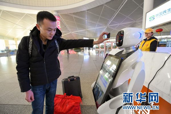 1月22日,在呼和浩特火車東站,旅客將車票放在智能機(jī)器人面前掃碼獲取乘車信息。新華社記者 彭源攝