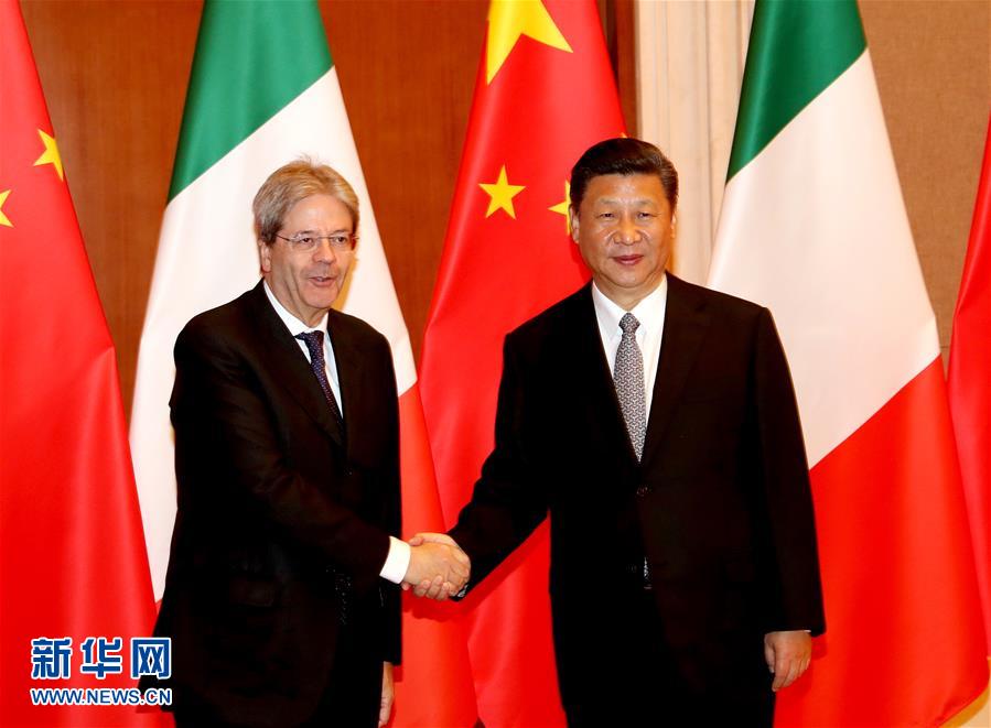 2017年5月16日,習近平在北京釣魚臺國賓館會見來華出席“一帶一路”國際合作高峰論壇的時任意大利總理真蒂洛尼。(新華社記者劉衛(wèi)兵攝)
