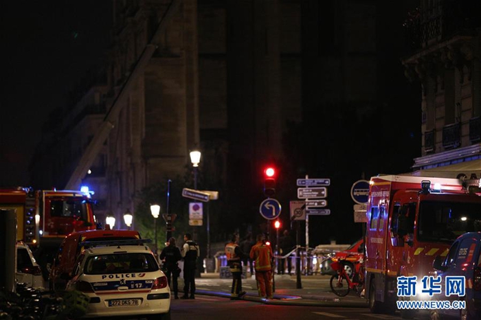4月15日,在法國(guó)巴黎,警車(chē)和消防車(chē)停靠在巴黎圣母院旁。新華社記者 高靜 攝