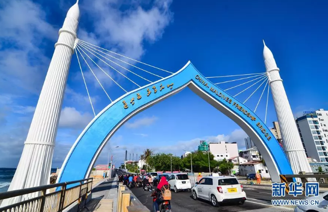 2018年10月2日,車輛從由中國(guó)援建、連接馬爾代夫首都馬累和機(jī)場(chǎng)島的中馬友誼大橋橋頭拱門穿過。新華社發(fā)(杜才良 攝)