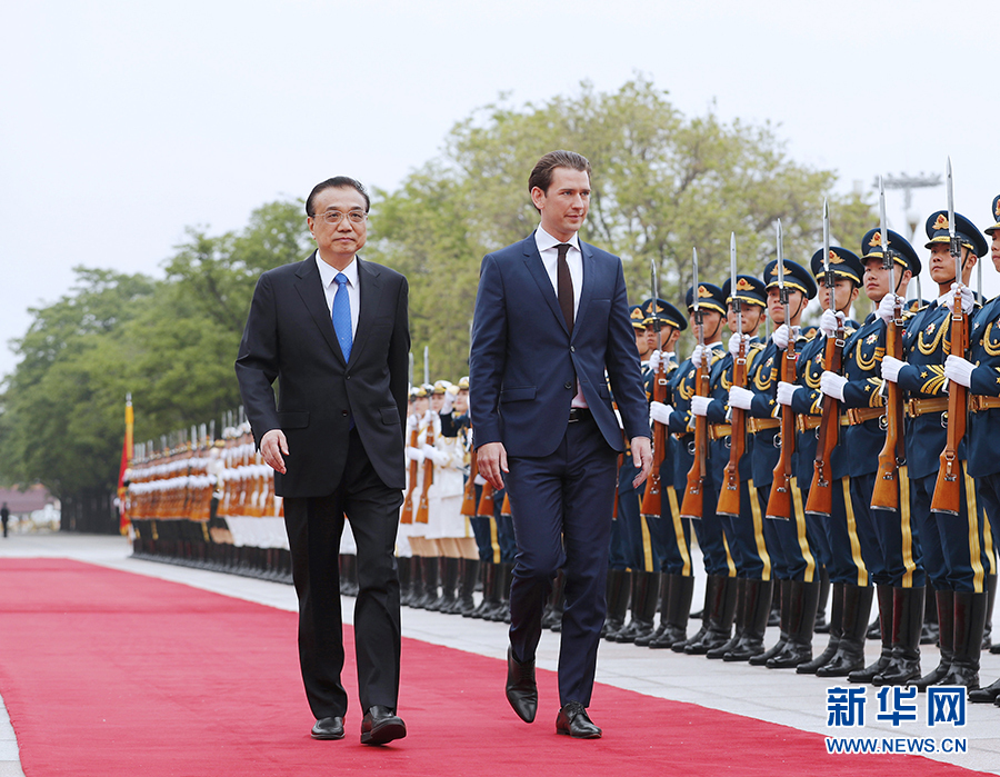 4月28日,國務(wù)院總理李克強(qiáng)在北京人民大會(huì)堂同奧地利總理庫爾茨舉行會(huì)談。這是會(huì)談前,李克強(qiáng)在人民大會(huì)堂東門外廣場(chǎng)為庫爾茨舉行歡迎儀式。新華社記者 劉彬 攝