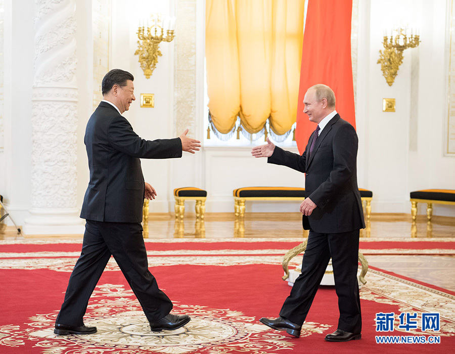 6月5日,國家主席習(xí)近平在莫斯科克里姆林宮同俄羅斯總統(tǒng)普京會談。這是兩國元首在會談前握手。 新華社記者 李學(xué)仁 攝