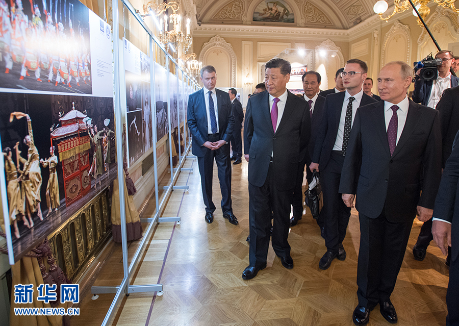 6月5日,國家主席習(xí)近平和俄羅斯總統(tǒng)普京在莫斯科大劇院共同出席中俄建交70周年紀(jì)念活動。這是兩國元首共同參觀中俄建交70周年圖片展。 新華社記者 李學(xué)仁 攝