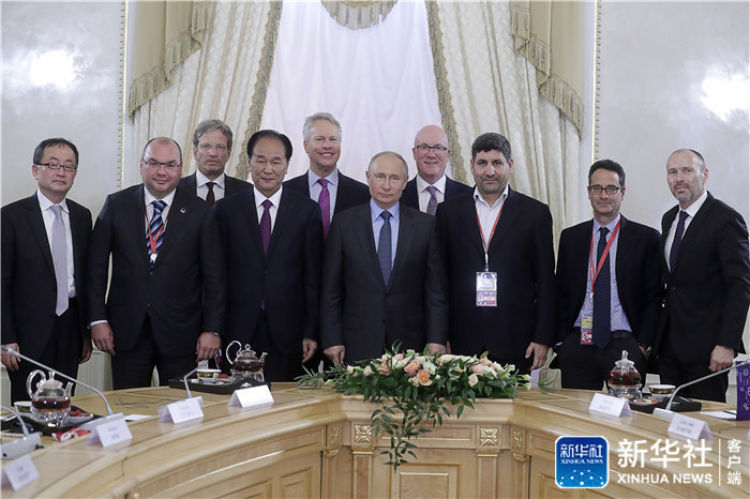 6月6日,在俄羅斯圣彼得堡,俄羅斯總統(tǒng)普京(右五)與新華社社長蔡名照(左四)等通訊社負(fù)責(zé)人合影。新華社/塔斯社