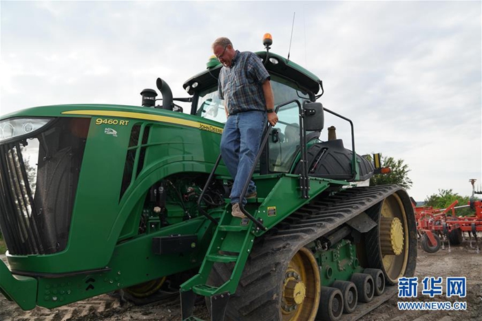 6月9日,在位于美國中部密蘇里州的小鎮(zhèn)奧里克,湯姆·沃特斯從一輛拖拉機(jī)上下來。新華社記者 劉杰 攝