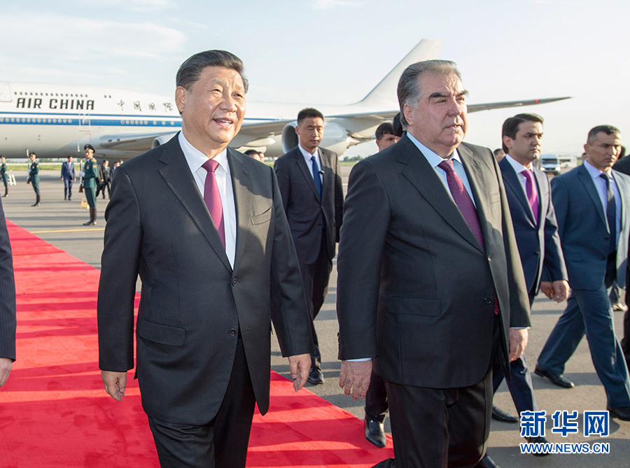 當(dāng)?shù)貢r(shí)間晚6時(shí)許,習(xí)近平乘坐的專機(jī)抵達(dá)杜尚別國(guó)際機(jī)場(chǎng)。習(xí)近平步出艙門,受到塔吉克斯坦總統(tǒng)拉赫蒙熱情迎接。塔吉克斯坦女青年向習(xí)近平獻(xiàn)花。禮兵分列紅地毯兩側(cè)。