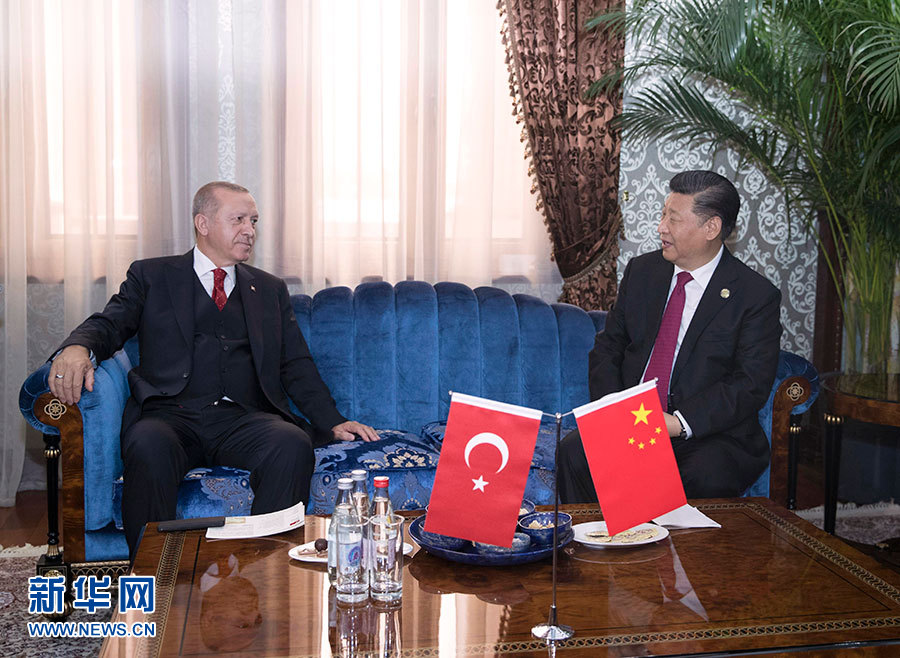 6月15日,國家主席習(xí)近平在杜尚別會(huì)見土耳其總統(tǒng)埃爾多安。 新華社記者 王曄 攝