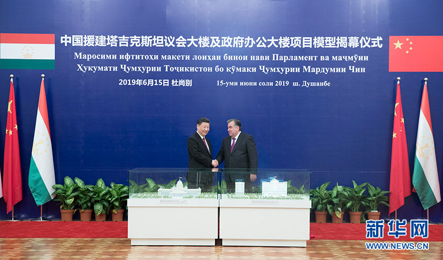 6月15日,國家主席習(xí)近平在杜尚別同塔吉克斯坦總統(tǒng)拉赫蒙會(huì)談。會(huì)談后,兩國元首共同出席中方援塔議會(huì)大樓、政府辦公大樓項(xiàng)目模型揭幕儀式。 新華社記者 王曄 攝