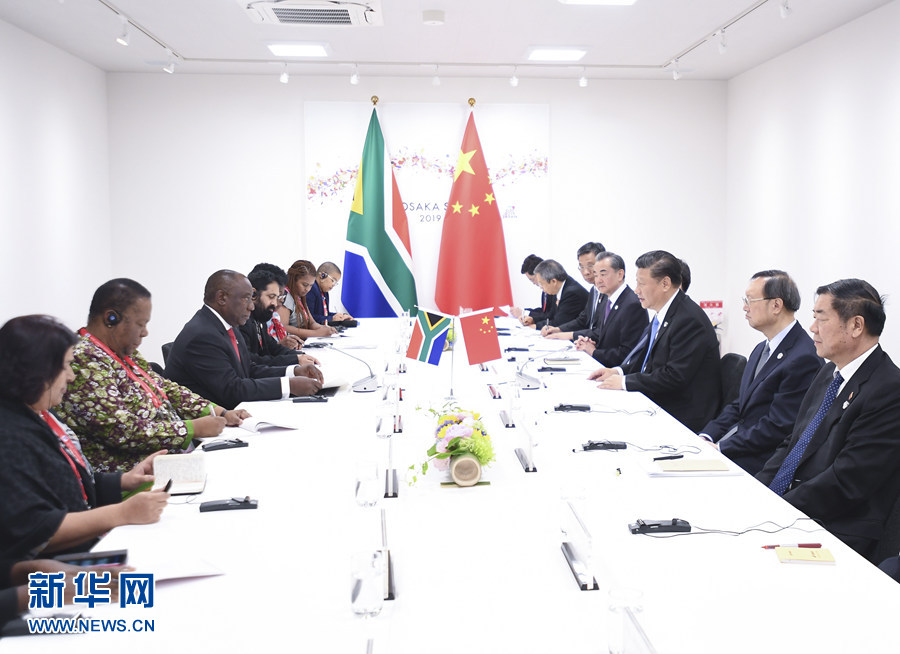 6月28日,國(guó)家主席習(xí)近平在大阪會(huì)見(jiàn)南非總統(tǒng)拉馬福薩。 新華社記者 龐興雷 攝
