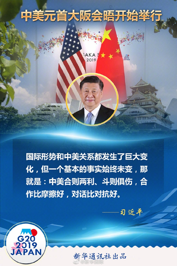 習(xí)近平在會(huì)晤開(kāi)始時(shí)說(shuō),很高興同總統(tǒng)先生在大阪見(jiàn)面。48年前,也就是1971年,就在離這里100多公里的名古屋,參加第三十一屆世界乒乓球錦標(biāo)賽的中美乒乓球運(yùn)動(dòng)員進(jìn)行了友好互動(dòng),這就是后來(lái)人們說(shuō)的“乒乓外交”的開(kāi)啟,創(chuàng)造了“小球轉(zhuǎn)動(dòng)大球”的歷史佳話(huà)。8年之后的1979年,中美建立了外交關(guān)系?;仡櫧ń灰詠?lái)的40年,國(guó)際形勢(shì)和中美關(guān)系都發(fā)生了巨大變化,但一個(gè)基本的事實(shí)始終未變,那就是:中美合則兩利、斗則俱傷,合作比摩擦好,對(duì)話(huà)比對(duì)抗好。近來(lái),我同總統(tǒng)先生通過(guò)電話(huà)和書(shū)信保持著密切聯(lián)系。今天,我愿同總統(tǒng)先生就事關(guān)中美關(guān)系發(fā)展的根本性問(wèn)題交換意見(jiàn),為下階段兩國(guó)關(guān)系發(fā)展定向把舵,推進(jìn)以協(xié)調(diào)、合作、穩(wěn)定為基調(diào)的中美關(guān)系。
