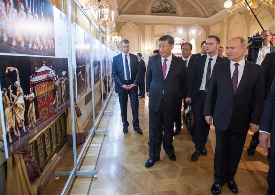 ↑6月5日,習(xí)主席和普京總統(tǒng)在莫斯科大劇院共同出席中俄建交70周年紀(jì)念活動?;顒忧?,兩國元首共同參觀中俄建交70周年圖片展。新華社記者李學(xué)仁攝