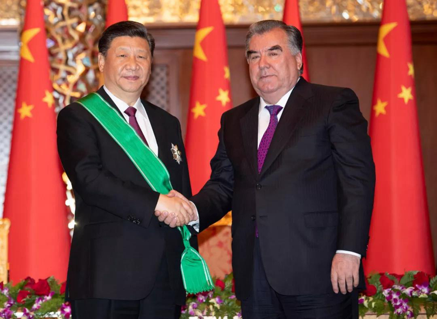 ↑熱恩別科夫總統(tǒng)和拉赫蒙總統(tǒng)分別向習(xí)主席授予各自國家最高獎?wù)?,感謝習(xí)主席為發(fā)展吉中、塔中友誼所作的卓越貢獻(xiàn)。照片分別由新華社記者謝環(huán)馳、沙達(dá)提攝