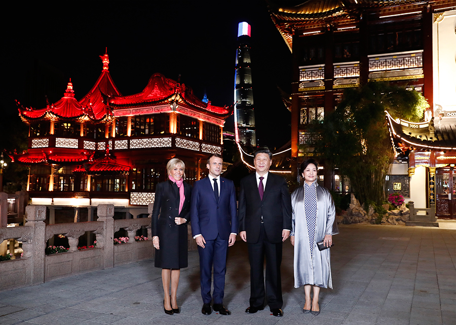 在前往北京前,5日晚,習近平主席和夫人彭麗媛在上??畲笋R克龍總統(tǒng)和夫人布麗吉特。地點是著名的江南古典園林——豫園。