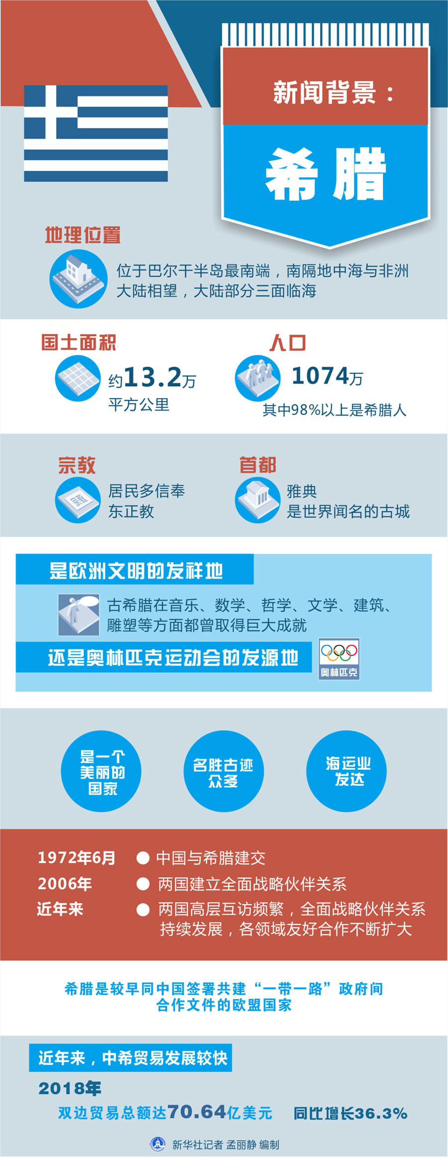 中國與希臘1972年6月建交。2006年,兩國建立全面戰(zhàn)略伙伴關(guān)系。近年來,兩國高層互訪頻繁,全面戰(zhàn)略伙伴關(guān)系持續(xù)發(fā)展,各領(lǐng)域友好合作不斷擴(kuò)大。希臘是較早同中國簽署共建“一帶一路”政府間合作文件的歐盟國家。近年來,中希貿(mào)易發(fā)展較快。2018年,雙邊貿(mào)易總額達(dá)70.64億美元,同比增長36.3%。