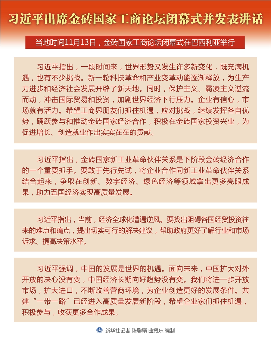 當(dāng)?shù)貢r間11月13日,金磚國家工商論壇閉幕式在巴西利亞舉行。國家主席習(xí)近平出席并發(fā)表講話。 新華社記者 謝環(huán)馳 攝