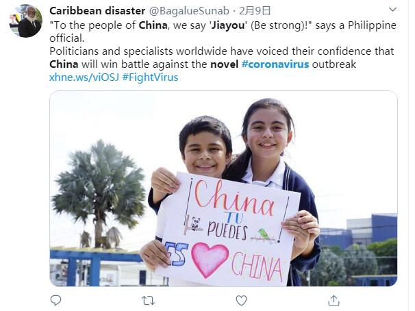 推特用戶Caribbean disaster說:一名菲律賓官員表示,想要對中國人民說,你們加油。世界各地的政治家和專家紛紛表示,對中國戰(zhàn)勝新冠疫情很有信心。(作者: 嚴玉潔 資料來源:新華社、央視網(wǎng)、人民網(wǎng)、國際在線等)