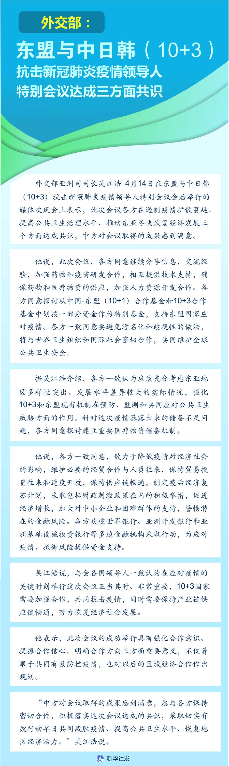 新華社北京4月14日電(記者伍岳)外交部亞洲司司長吳江浩14日在東盟與中日韓(10+3)抗擊新冠肺炎疫情領(lǐng)導(dǎo)人特別會議會后舉行的媒體吹風(fēng)會上表示,此次會議各方在遏制疫情擴散蔓延、提高公共衛(wèi)生治理水平、推動?xùn)|亞盡快恢復(fù)經(jīng)濟發(fā)展三個方面達成共識,中方對會議取得的成果感到滿意。