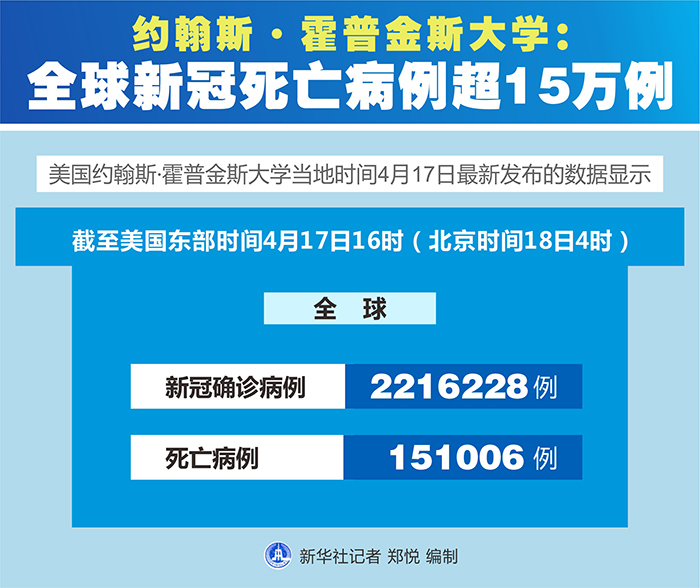 新華社紐約4月17日電 美國約翰斯·霍普金斯大學(xué)17日最新發(fā)布的數(shù)據(jù)顯示,截至美國東部時間17日16時(北京時間18日4時),全球新冠死亡病例超過15萬例,達到151006例,全球確診病例達2216228例。
