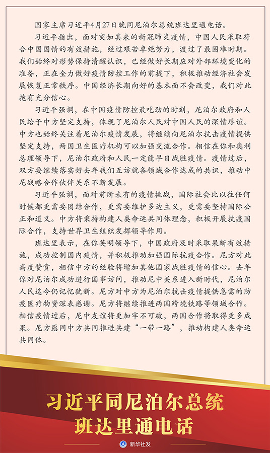 新華社北京4月27日電 國家主席習(xí)近平27日晚同尼泊爾總統(tǒng)班達里通電話。
