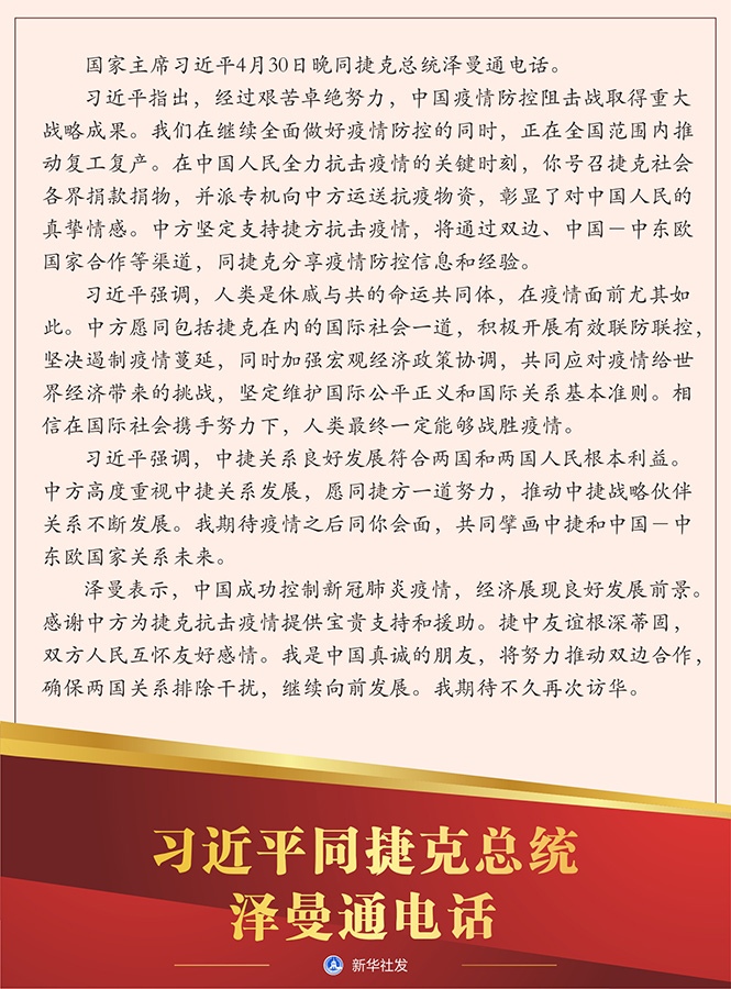 習(xí)近平指出,經(jīng)過(guò)艱苦卓絕努力,中國(guó)疫情防控阻擊戰(zhàn)取得重大戰(zhàn)略成果。我們?cè)诶^續(xù)全面做好疫情防控的同時(shí),正在全國(guó)范圍內(nèi)推動(dòng)復(fù)工復(fù)產(chǎn)。在中國(guó)人民全力抗擊疫情的關(guān)鍵時(shí)刻,你號(hào)召捷克社會(huì)各界捐款捐物,并派專機(jī)向中方運(yùn)送抗疫物資,彰顯了對(duì)中國(guó)人民的真摯情感。中方堅(jiān)定支持捷方抗擊疫情,將通過(guò)雙邊、中國(guó)-中東歐國(guó)家合作等渠道,同捷克分享疫情防控信息和經(jīng)驗(yàn)。