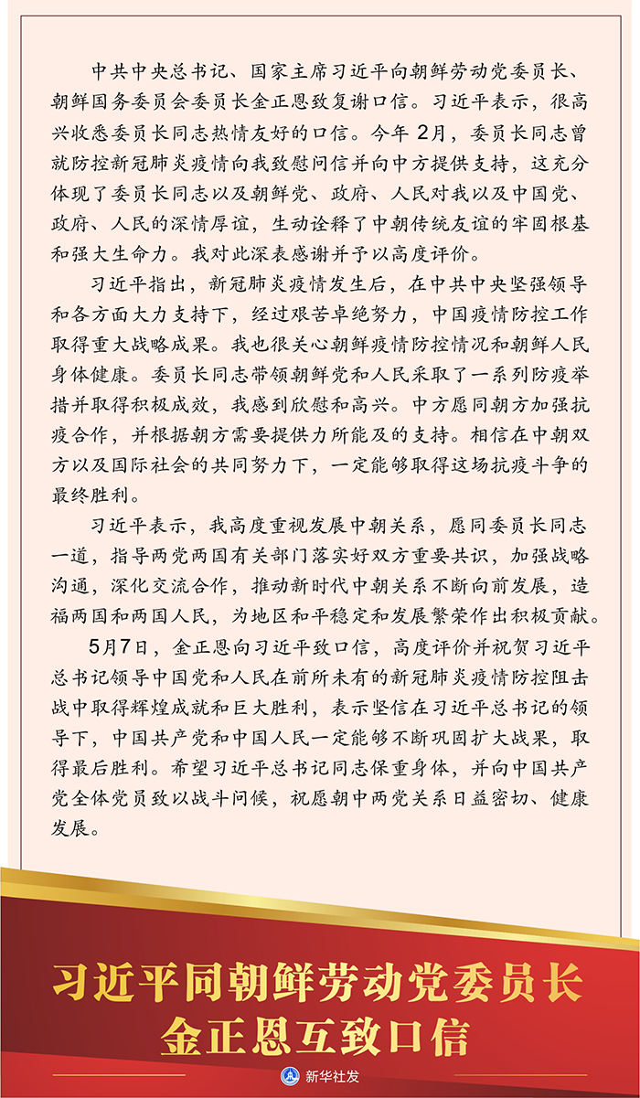 5月7日,金正恩向習(xí)近平致口信,高度評價并祝賀習(xí)近平總書記領(lǐng)導(dǎo)中國黨和人民在前所未有的新冠肺炎疫情防控阻擊戰(zhàn)中取得輝煌成就和巨大勝利,表示堅信在習(xí)近平總書記的領(lǐng)導(dǎo)下,中國共產(chǎn)黨和中國人民一定能夠不斷鞏固擴(kuò)大戰(zhàn)果,取得最后勝利。希望習(xí)近平總書記同志保重身體,并向中國共產(chǎn)黨全體黨員致以戰(zhàn)斗問候,祝愿朝中兩黨關(guān)系日益密切、健康發(fā)展。