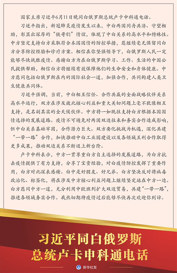 習(xí)近平指出,新冠肺炎疫情發(fā)生以來,中白兩國同舟共濟、守望相助,彰顯出深厚的“鐵哥們”情誼,體現(xiàn)了中白關(guān)系的高水平和特殊性。中方堅定支持白方采取符合本國國情的防控舉措,愿繼續(xù)毫無保留同白方分享防控經(jīng)驗和診療方案。相信在你堅強領(lǐng)導(dǎo)下,白俄羅斯人民一定能夠盡快戰(zhàn)勝疫情。感謝白方為在白俄羅斯學(xué)習(xí)、工作、生活的中國公民提供幫助,相信白方將繼續(xù)有效保障他們的生命安全和身體健康。中方愿同包括白俄羅斯在內(nèi)的國際社會一道,加強合作,共同構(gòu)建人類衛(wèi)生健康共同體。