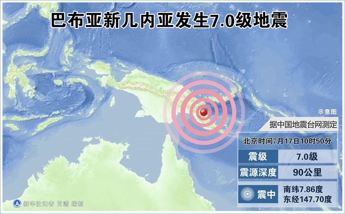 新華社快訊:中國(guó)地震臺(tái)網(wǎng)正式測(cè)定:7月17日10時(shí)50分在巴布亞新幾內(nèi)亞(南緯7.86度,東經(jīng)147.70度)發(fā)生7.0級(jí)地震,震源深度90千米。