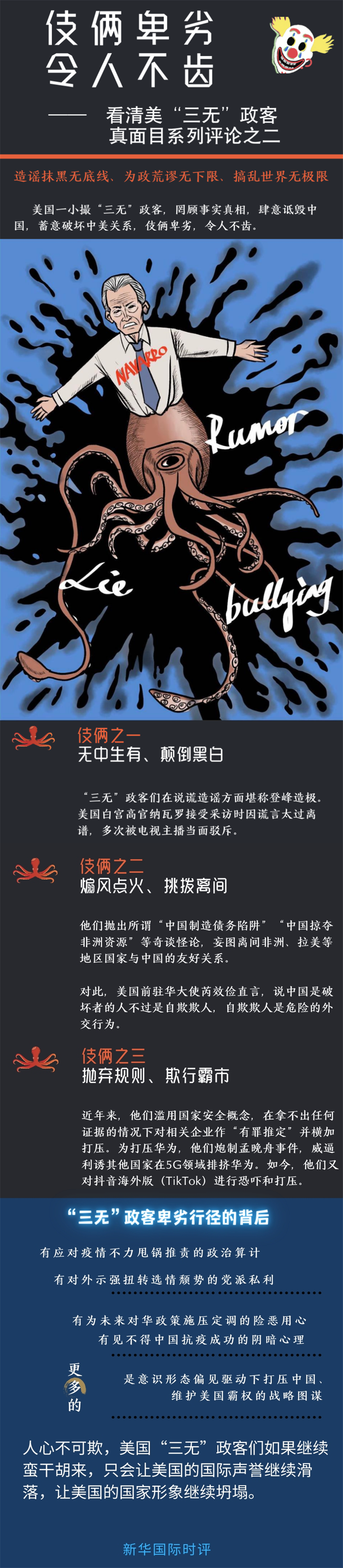 在這些“三無”政客卑劣行徑的背后,有應(yīng)對(duì)疫情不力甩鍋推責(zé)的政治算計(jì),有對(duì)外示強(qiáng)扭轉(zhuǎn)選情頹勢(shì)的黨派私利,有為未來對(duì)華政策施壓定調(diào)的險(xiǎn)惡用心,有見不得中國抗疫成功的陰暗心理,更多的是意識(shí)形態(tài)偏見驅(qū)動(dòng)下打壓中國、維護(hù)美國霸權(quán)的戰(zhàn)略圖謀。