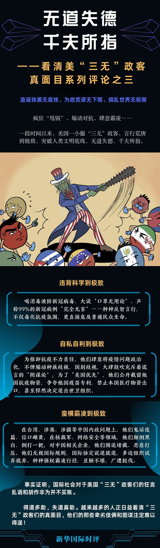 瘋狂“甩鍋”、煽動對抗、肆意霸凌……一段時間以來,美國一小撮造謠抹黑無底線、為政荒謬無下限、搞亂世界無極限的“三無”政客,言行荒唐到極致,突破人類文明底線,無道失德,千夫所指。